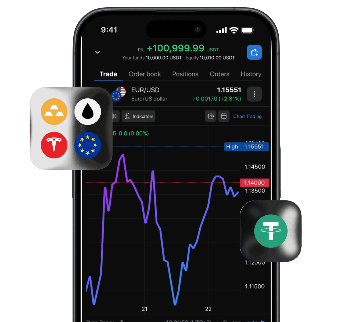 Mantenha suas criptomoedas e opere TradFi. Use USDT, USDC, BTC ou ETH como margem, sem a necessidade de conversão.